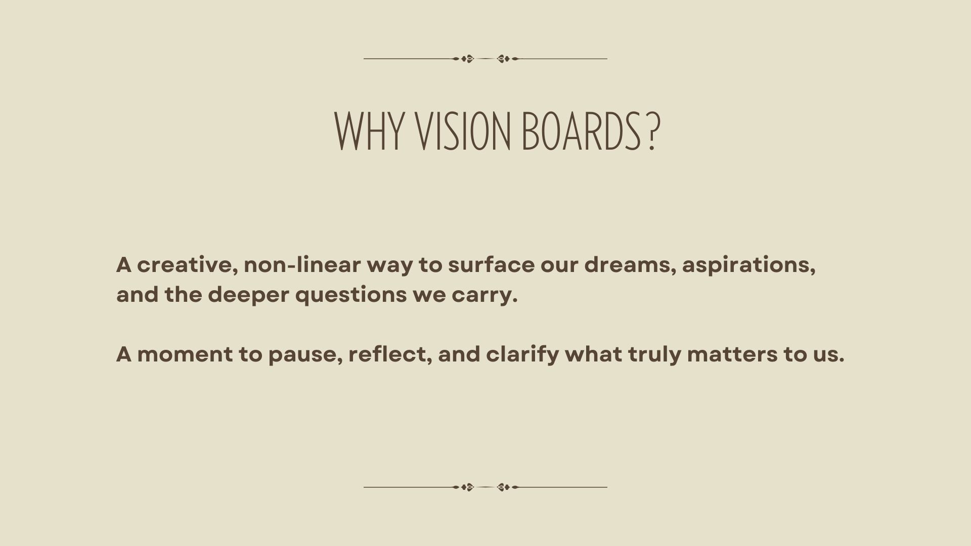 Vision boards are a powerful tool for self-reflection and intentional living. What makes them especially valuable is their simplicity—they offer a creative, non-linear way to surface our dreams, aspirations, and the deeper questions we carry. The very act of creating a vision board can be meditative—a moment to pause, reflect, and clarify what truly matters to us.